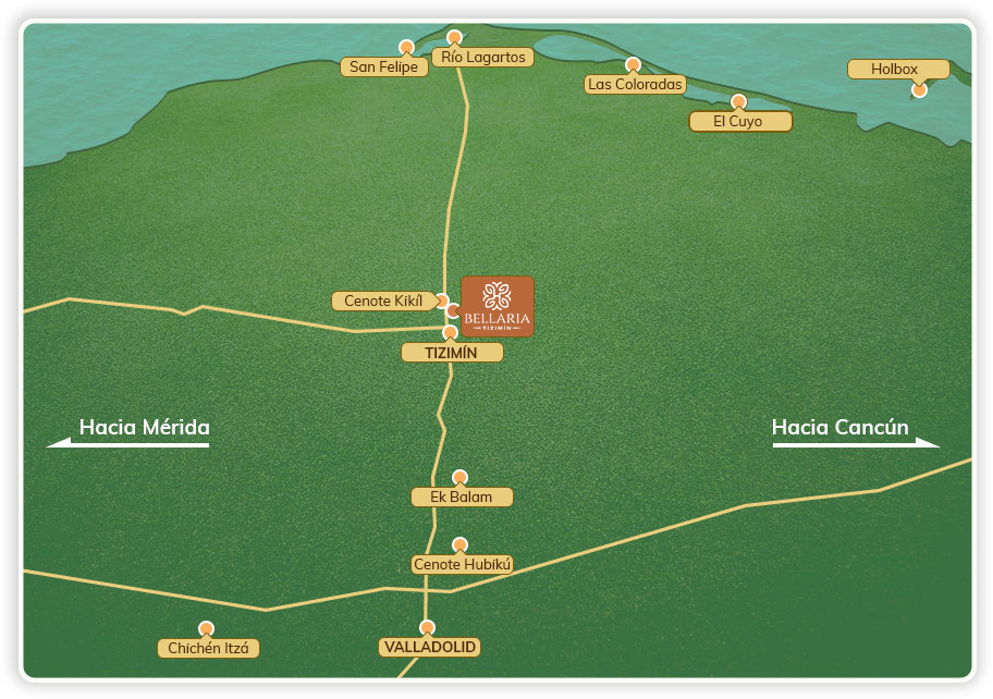 Bellaria es un desarrollo ubicado estratégicamente en Tizimín, uno de los municipios más extensos del estado de Yucatán. Se localiza dentro de la mancha urbana a orilla de la carretera que va de Tizimín a Rio lagartos. Al encontrarse dentro de la ciudad, tiene garantizado una plusvalía inmediata.